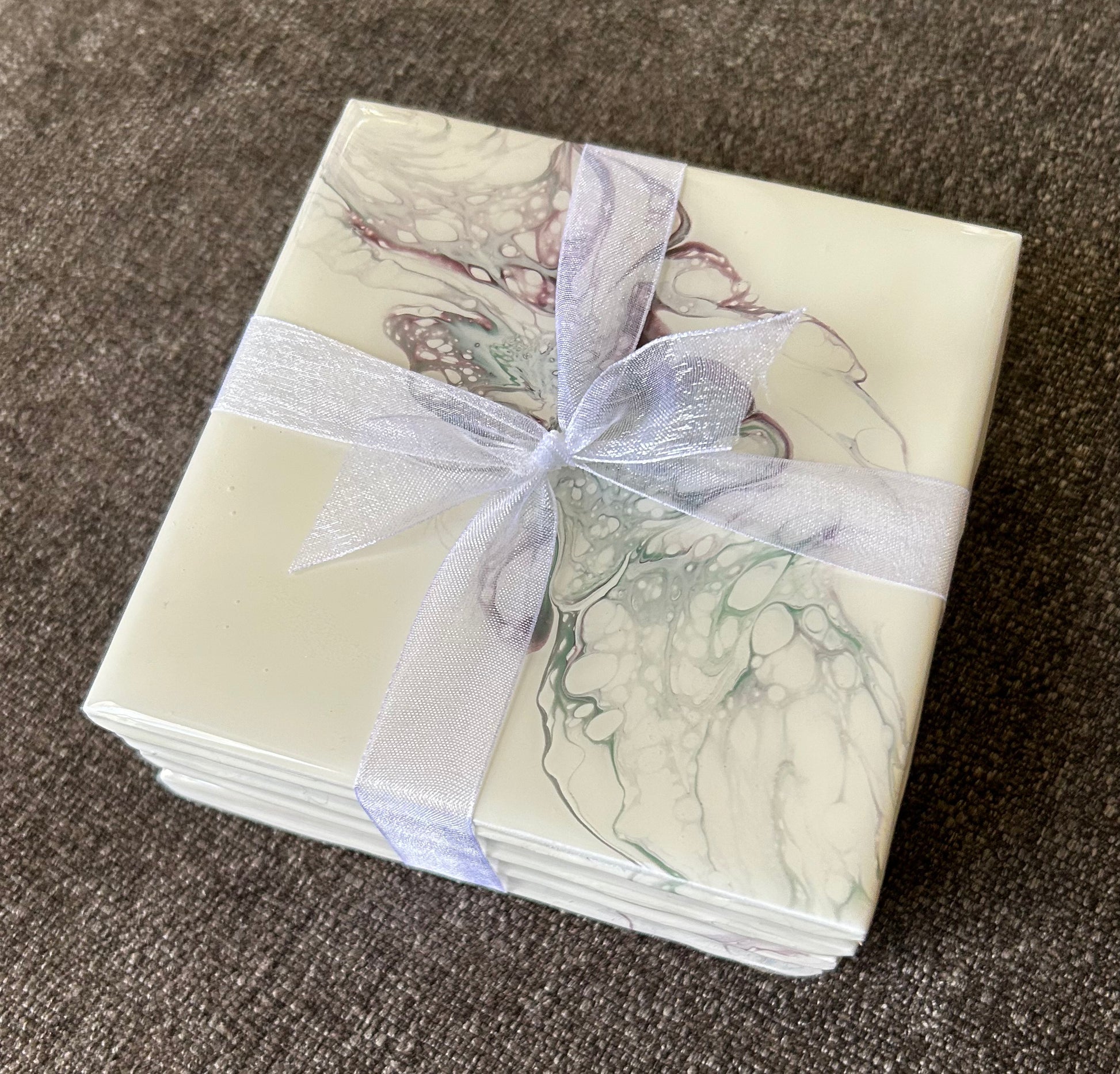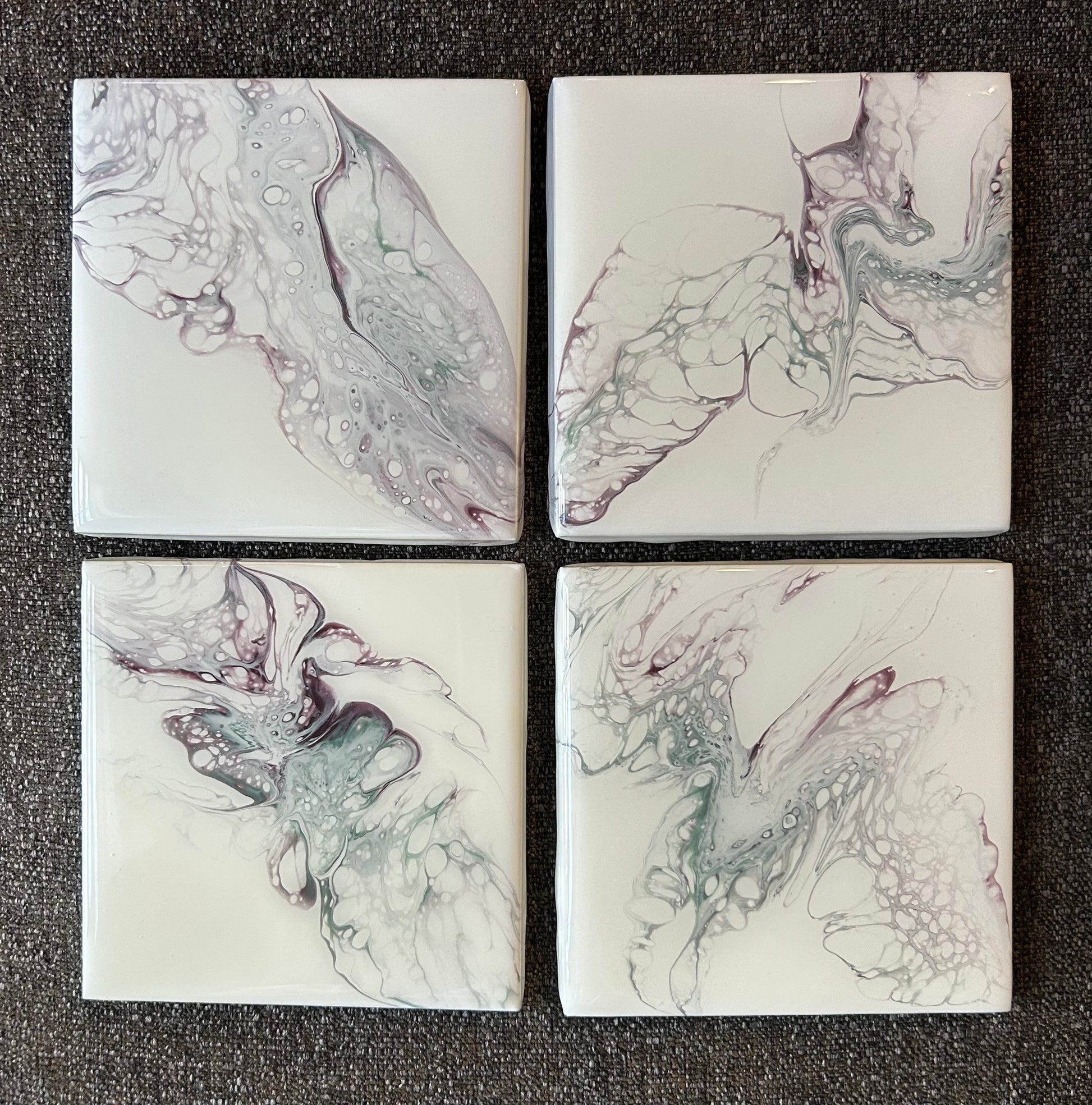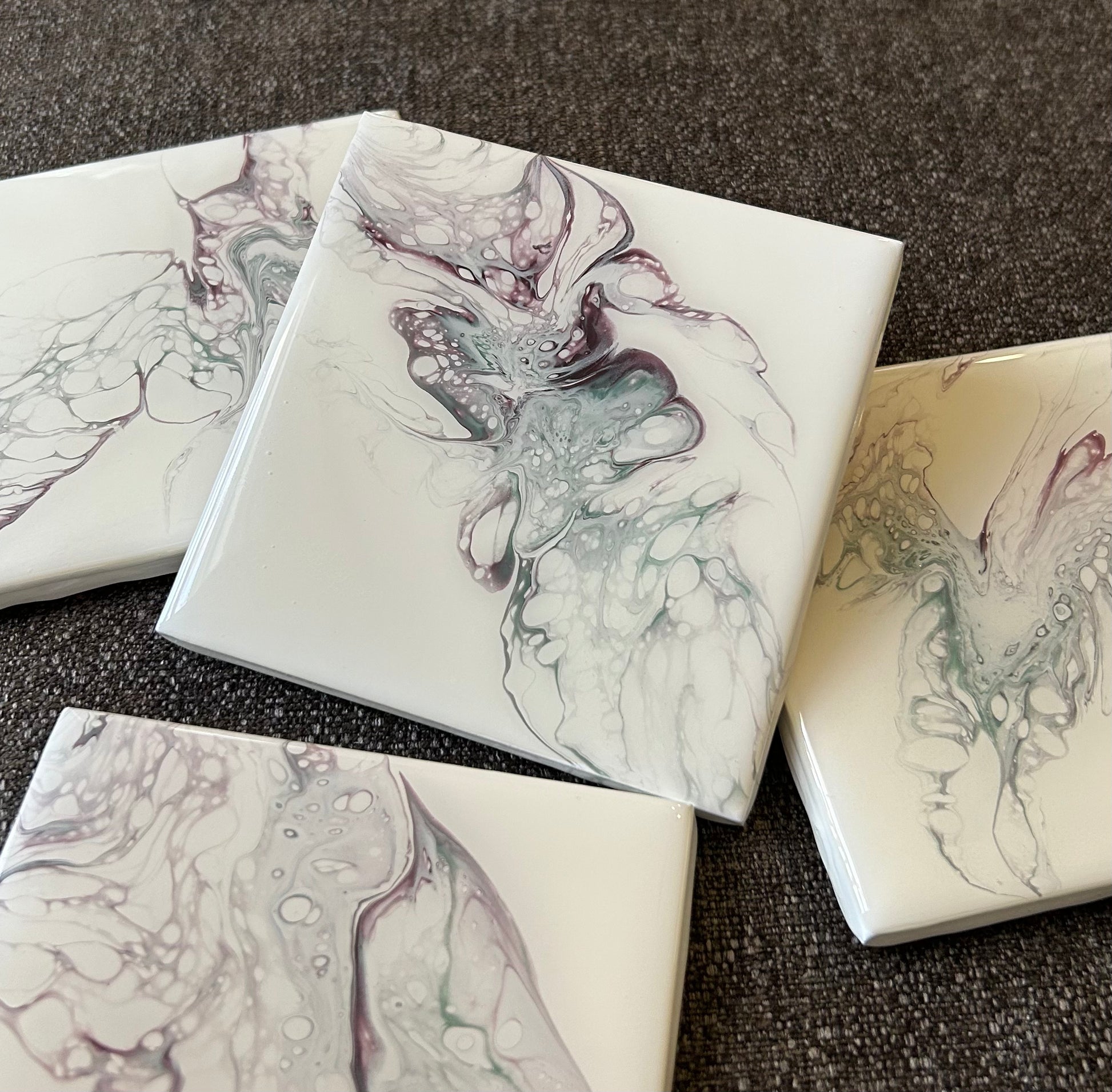 These beautiful fluid art coasters are hand painted and uniquely designed in shades of ivory, purple and green. The set includes 4 different coasters using the same colors so they compliment each other. Each tile measures 4x4 and has been resin sealed and finished with a cork backing to protect furniture. The ceramic tiles can be used for hot or cold beverages.