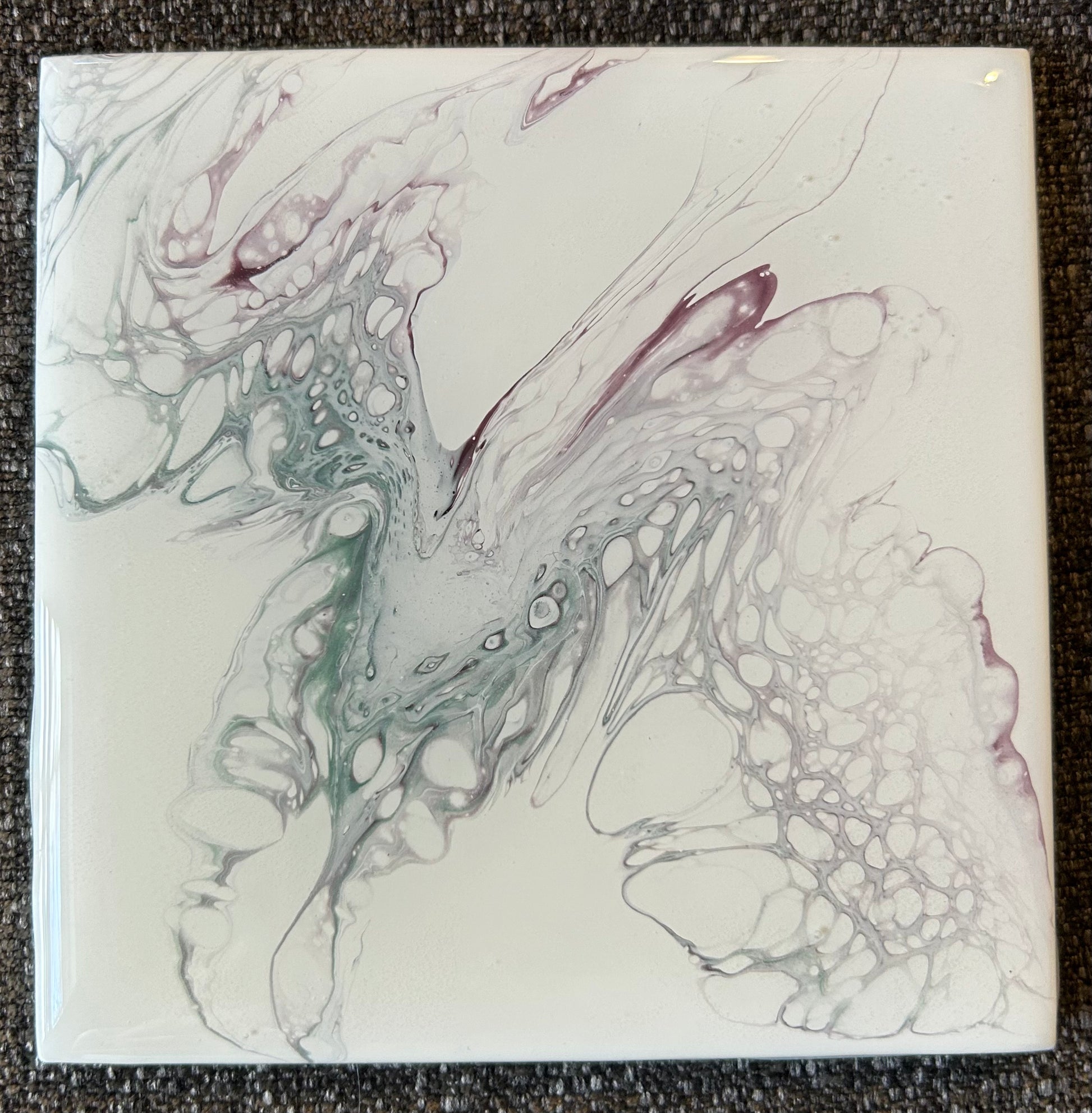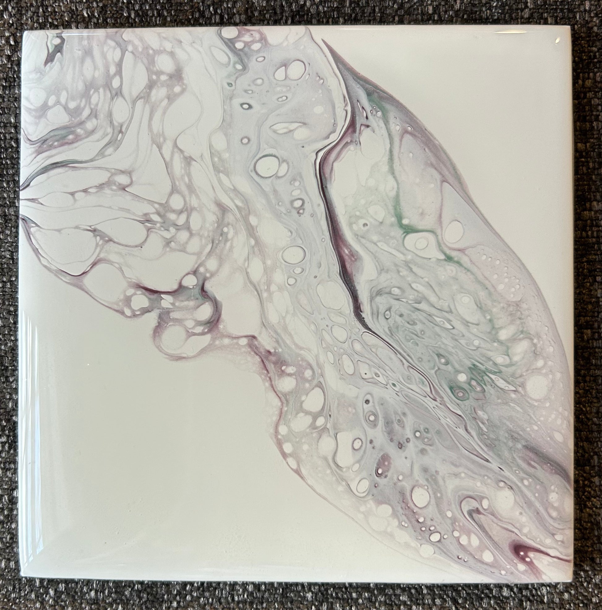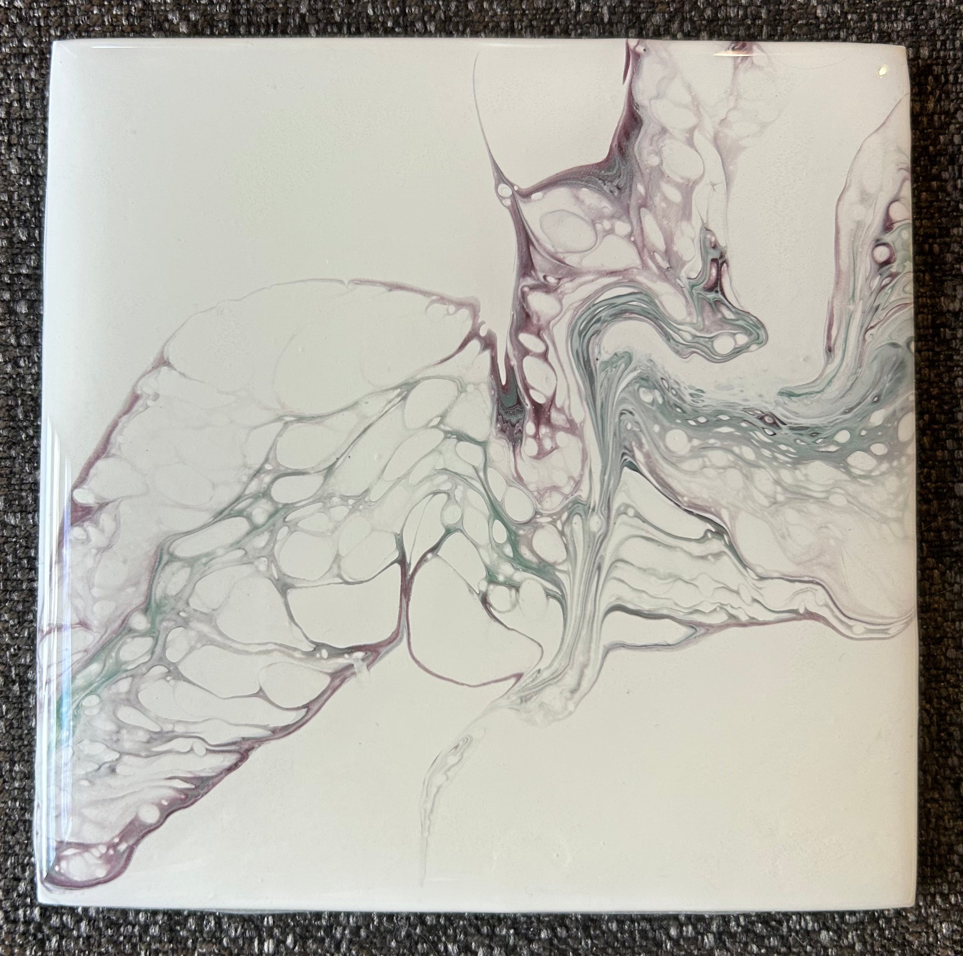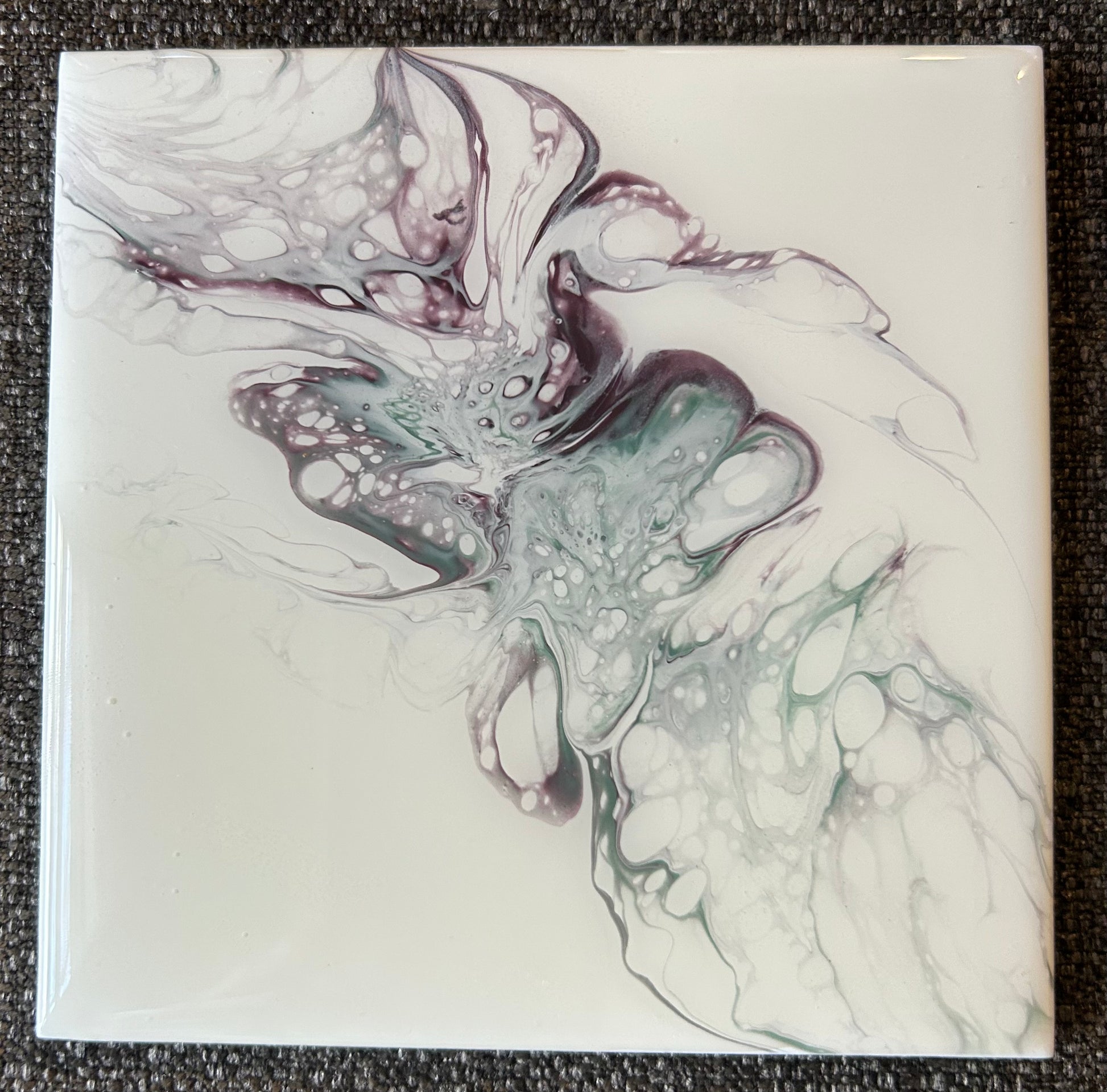 These beautiful fluid art coasters are hand painted and uniquely designed in shades of ivory, purple and green. The set includes 4 different coasters using the same colors so they compliment each other. Each tile measures 4x4 and has been resin sealed and finished with a cork backing to protect furniture. The ceramic tiles can be used for hot or cold beverages.