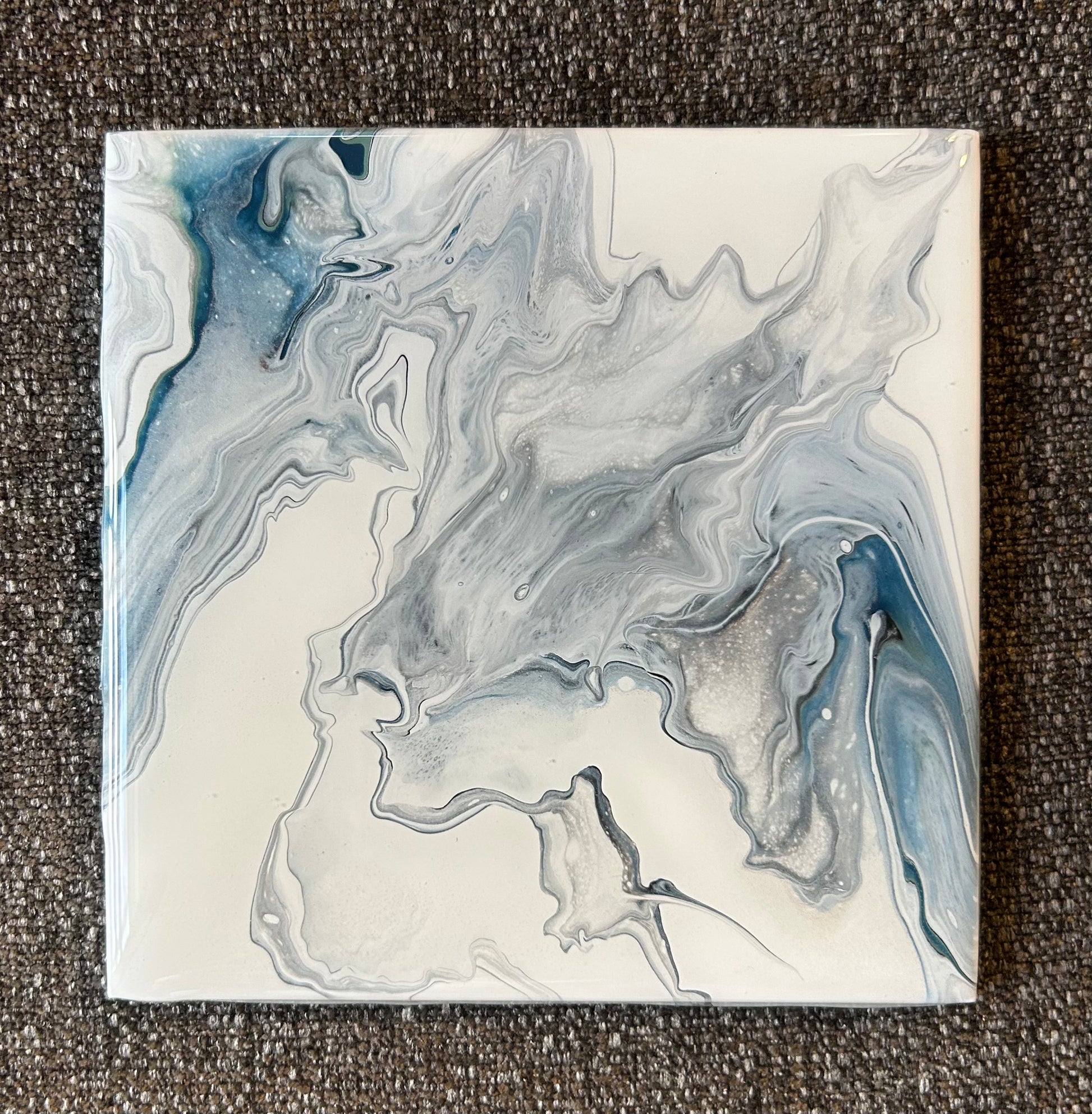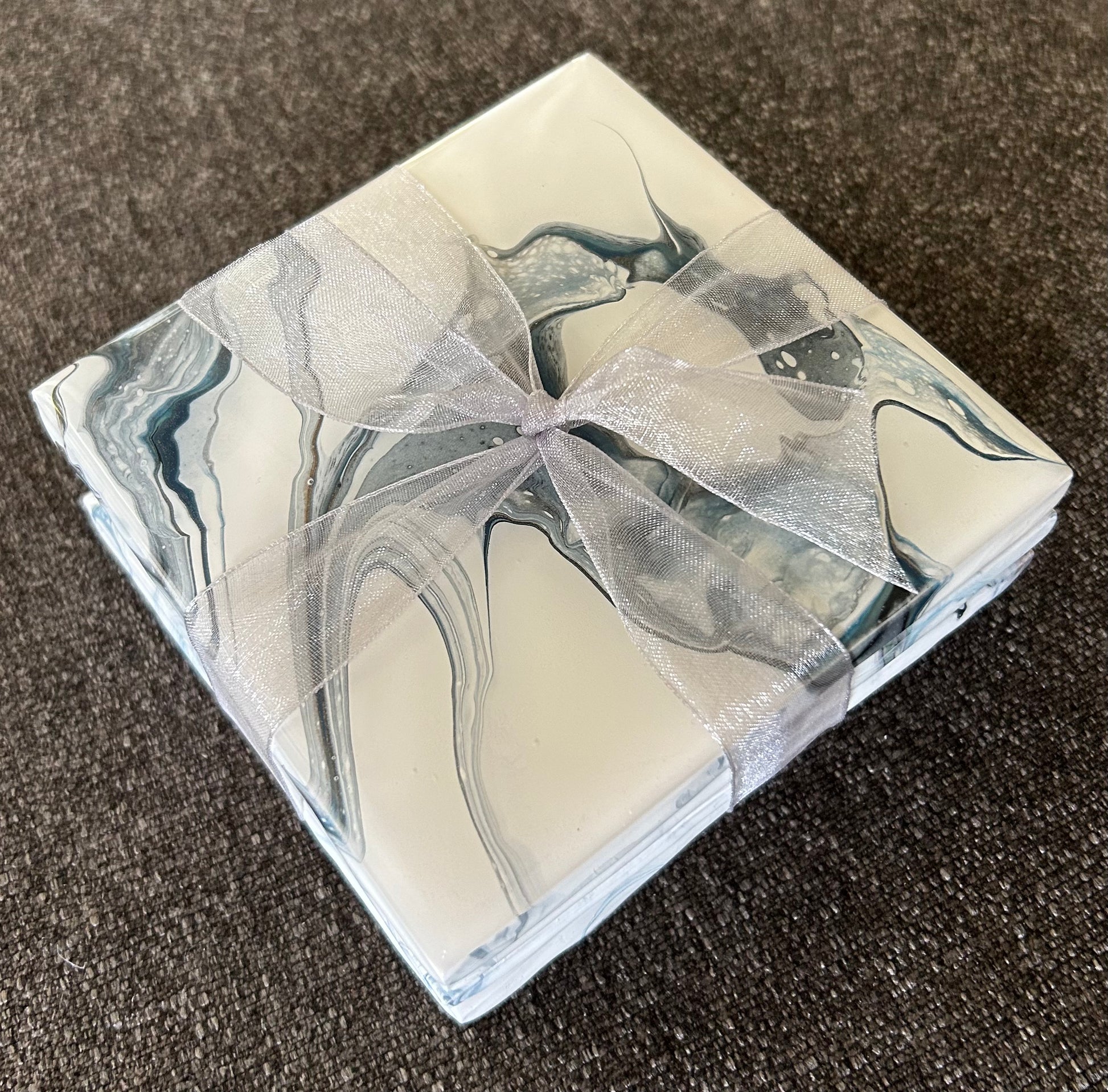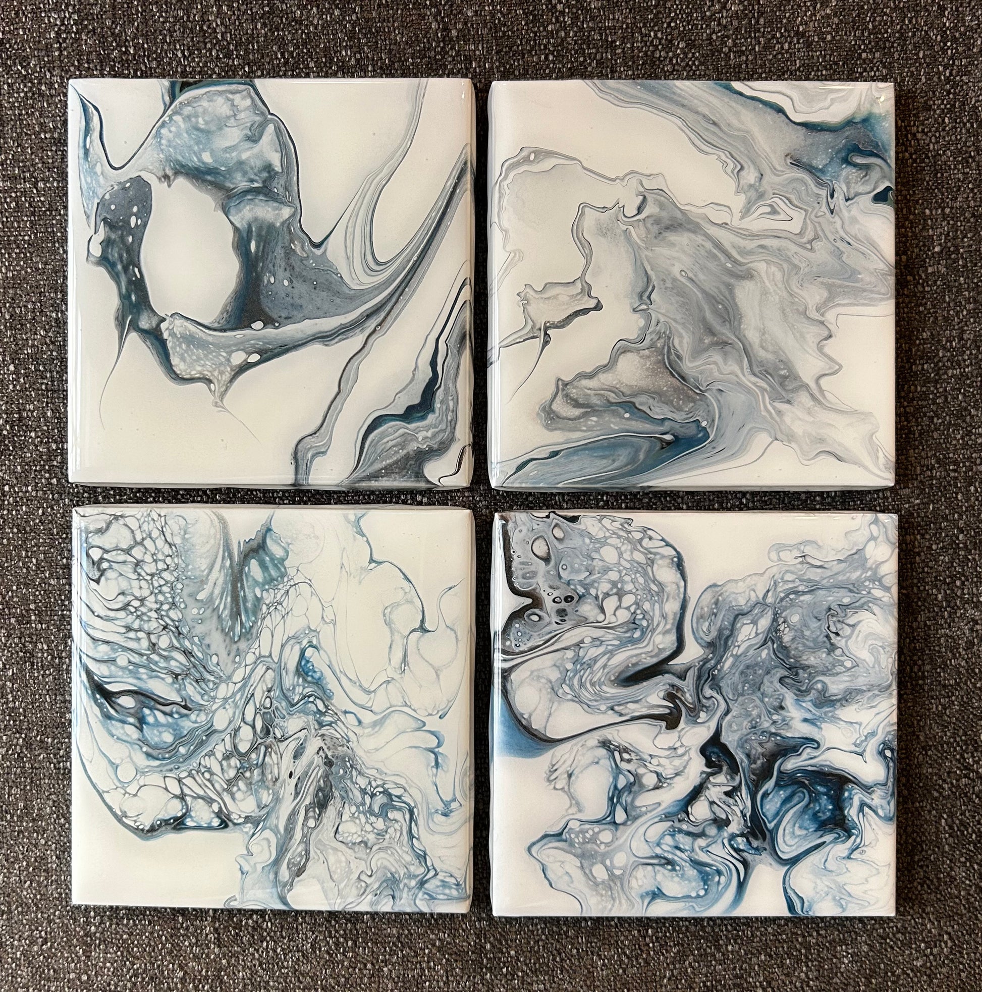 These beautiful fluid art coasters are hand painted and uniquely designed in shades of ivory, blue, gray and silver. The set includes 4 different coasters using the same colors so they compliment each other. Each tile measures 4x4 and has been resin sealed and finished with a cork backing to protect furniture. The ceramic tiles can be used for hot or cold beverages.