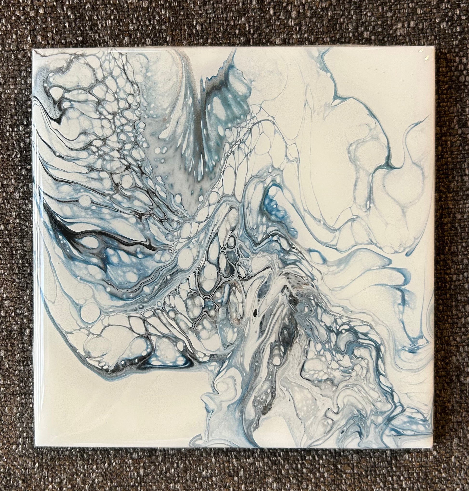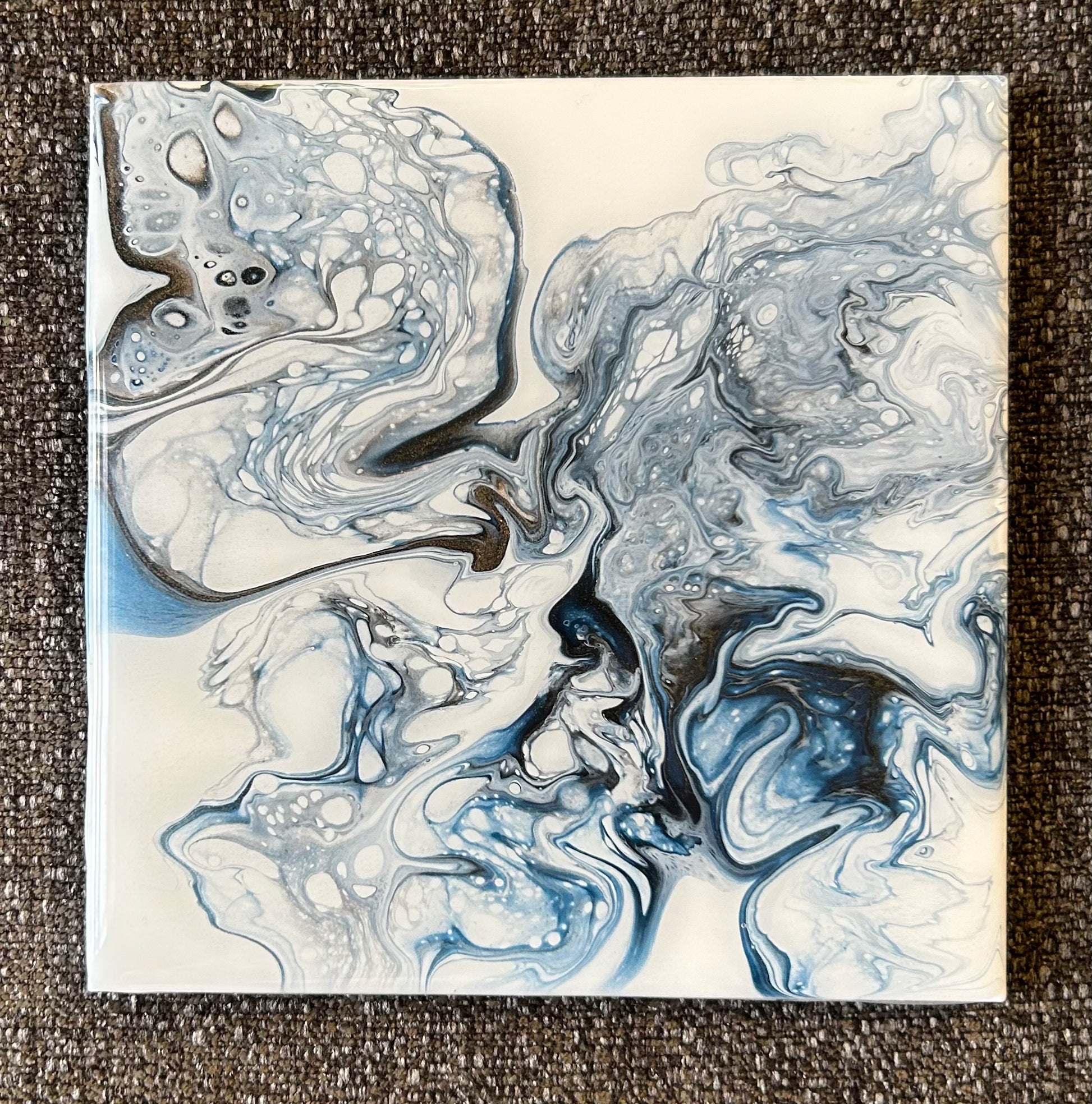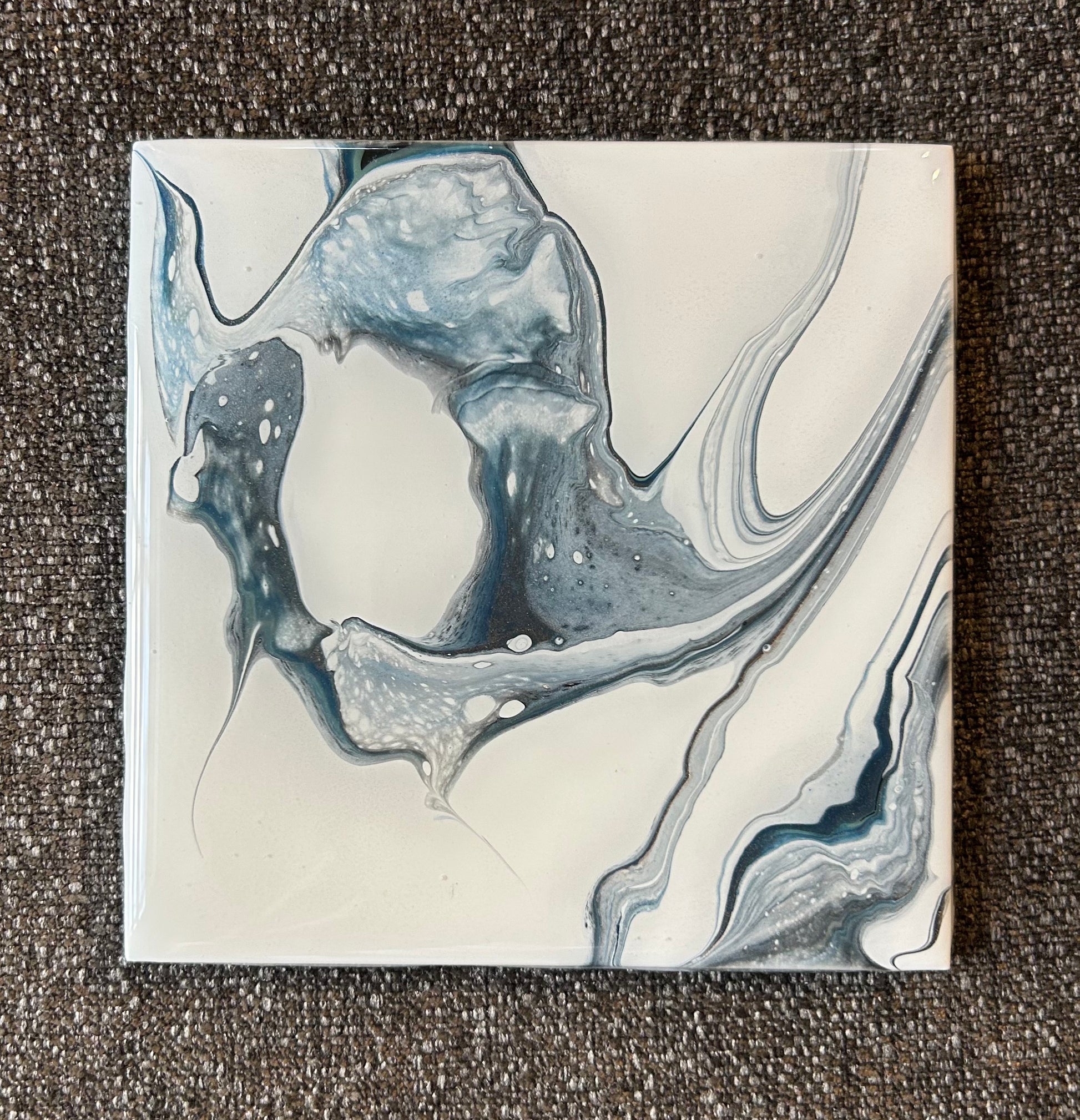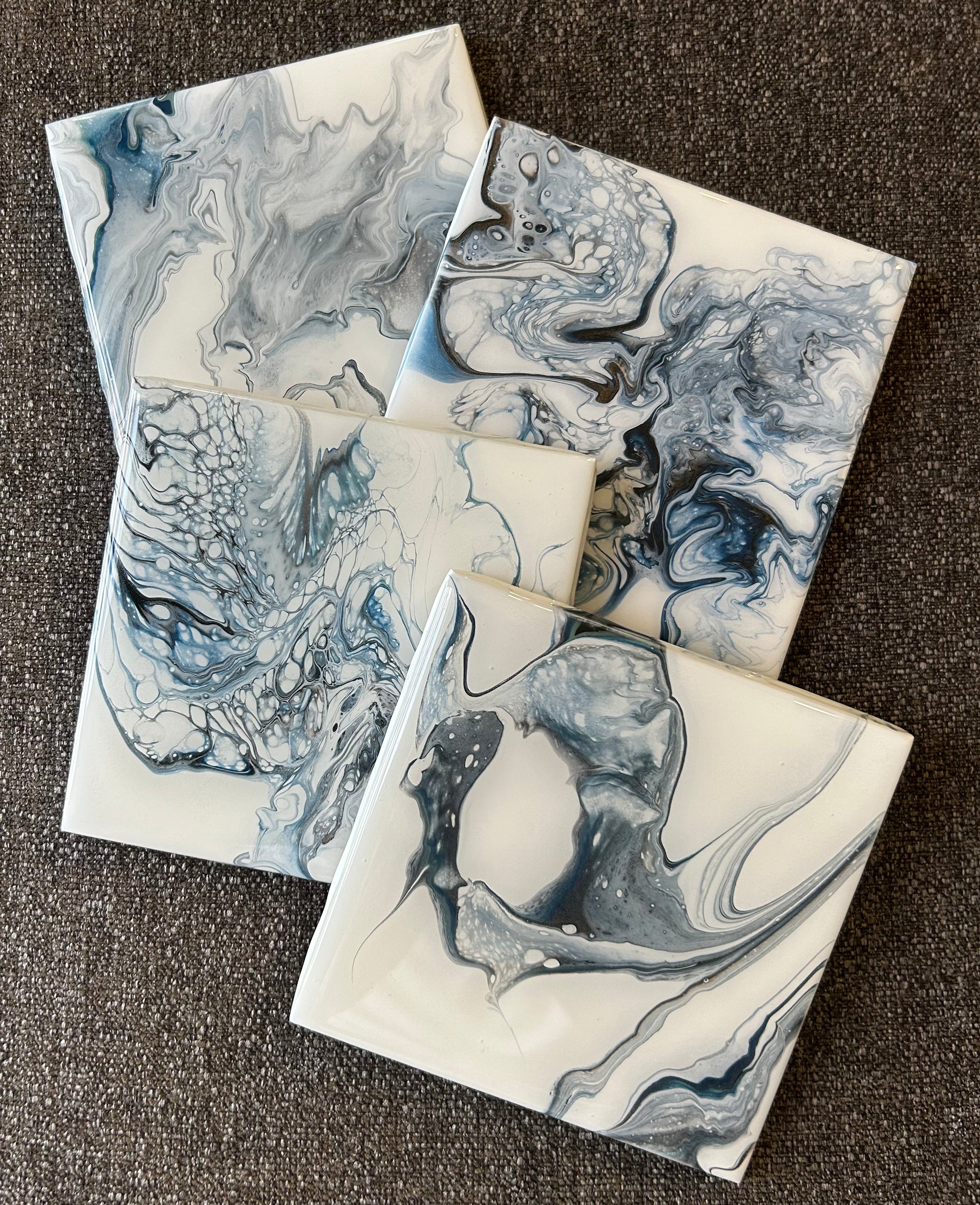 These beautiful fluid art coasters are hand painted and uniquely designed in shades of ivory, blue, gray and silver. The set includes 4 different coasters using the same colors so they compliment each other. Each tile measures 4x4 and has been resin sealed and finished with a cork backing to protect furniture. The ceramic tiles can be used for hot or cold beverages.