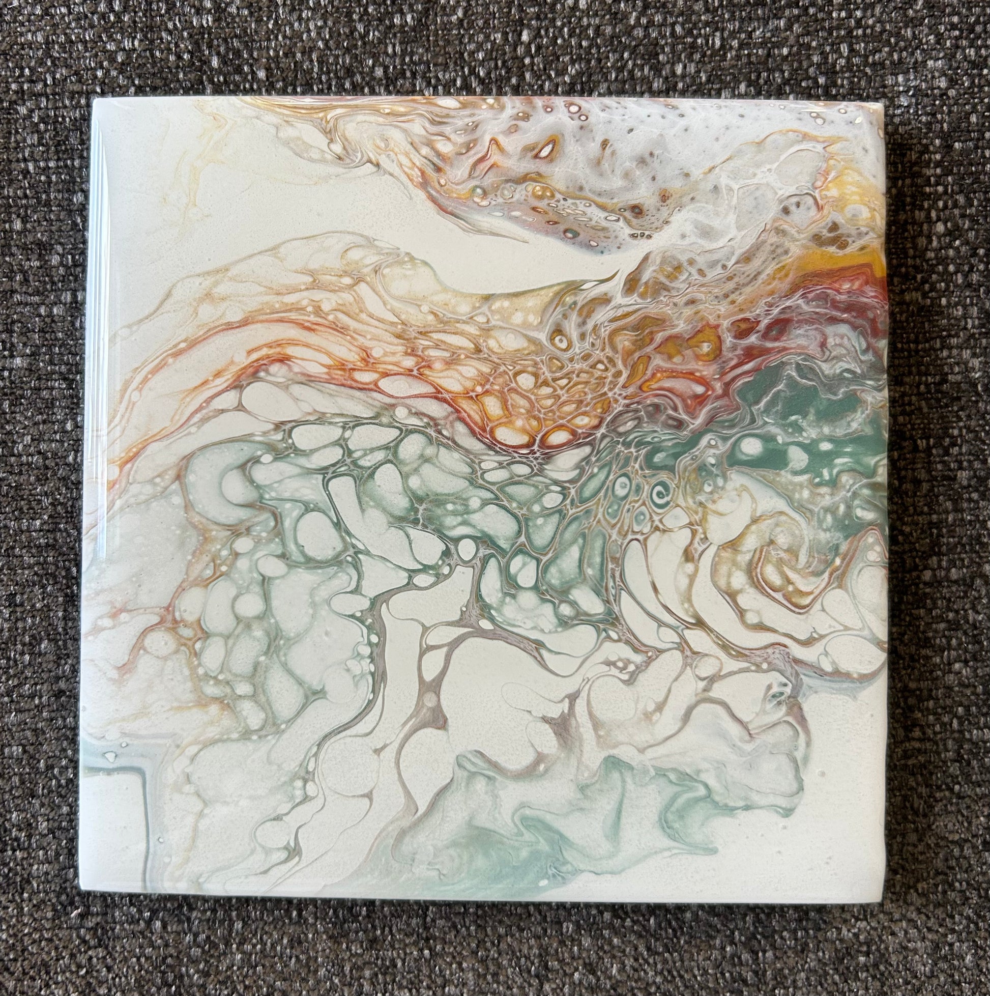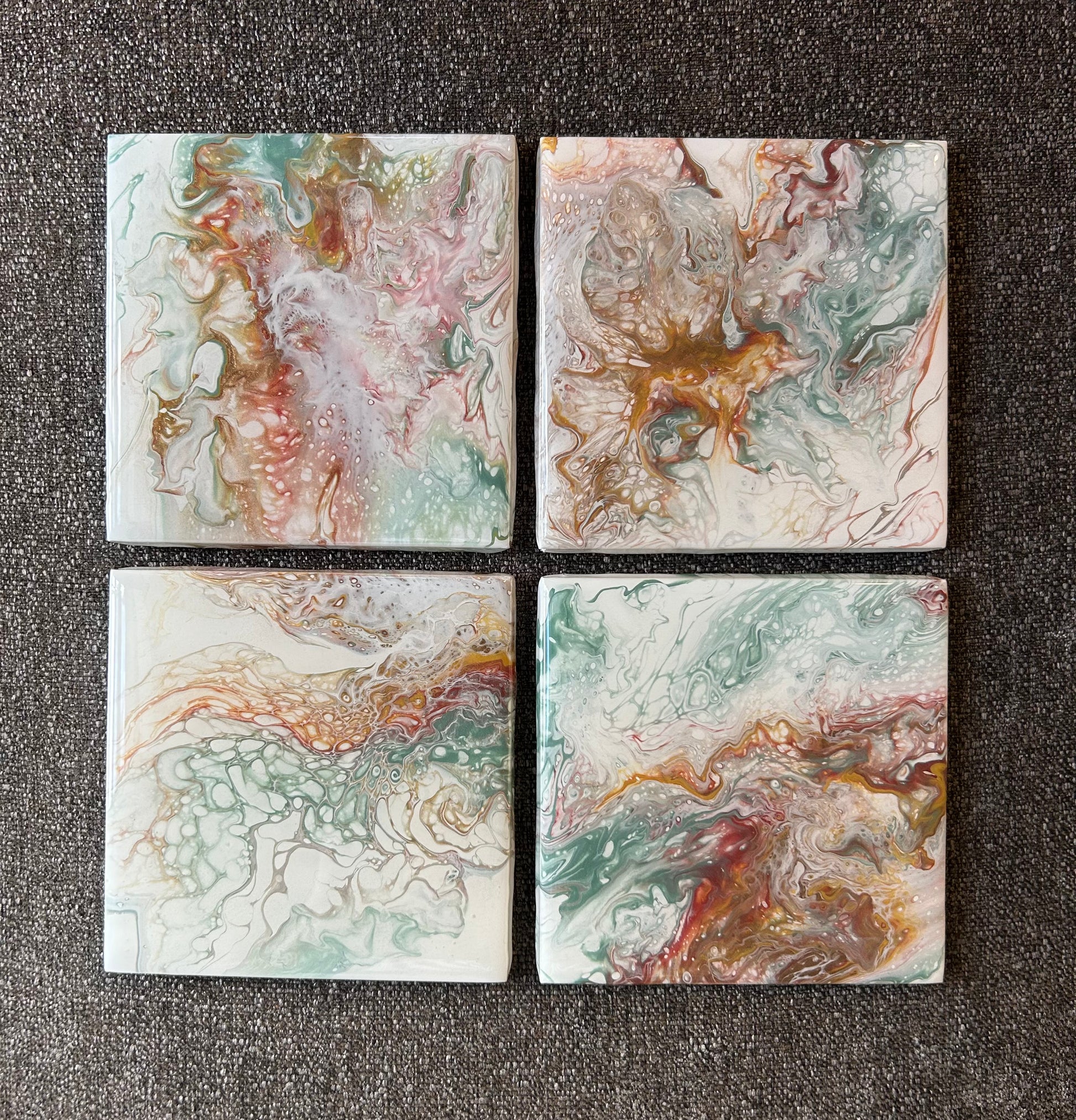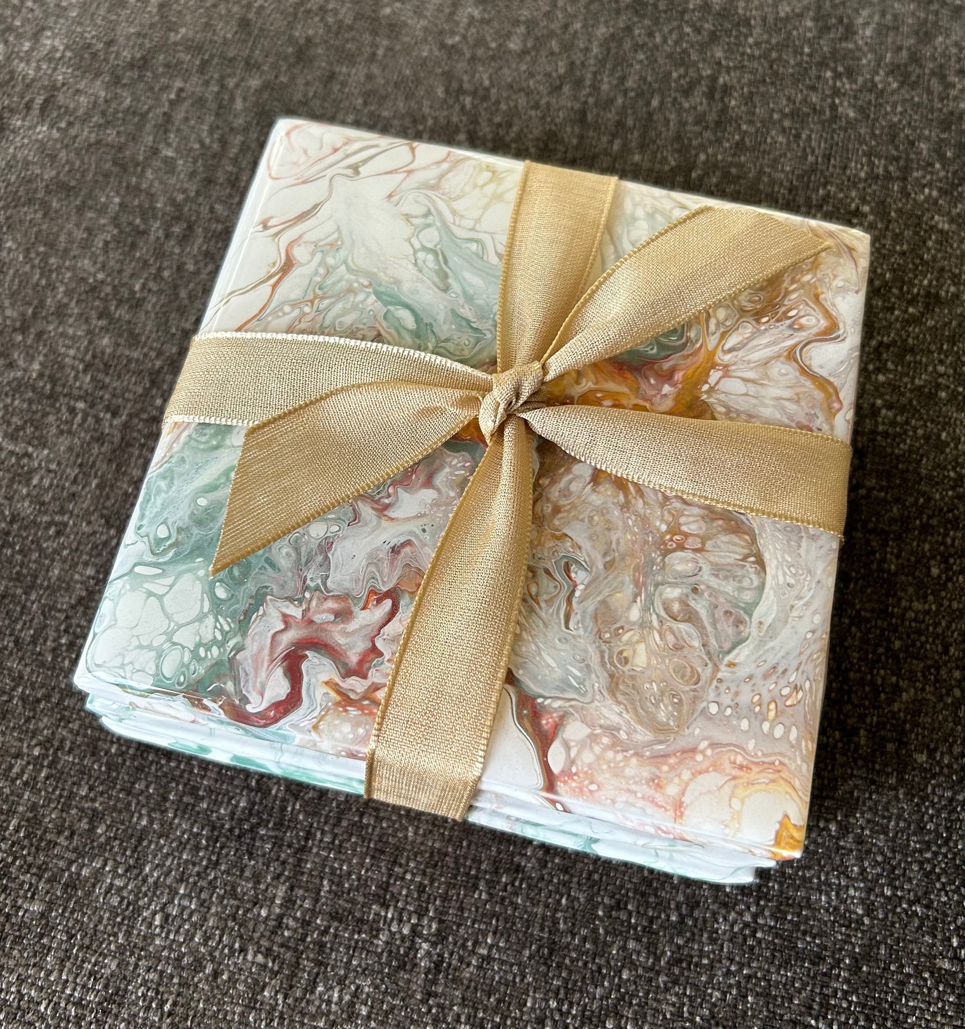 These beautiful fluid art coasters are hand painted and uniquely designed in shades of ivory, green, cranberry, mustard and copper. The set includes 4 different coasters using the same colors so they compliment each other. Each tile measures 4x4 and has been resin sealed and finished with a cork backing to protect furniture. The ceramic tiles can be used for hot or cold beverages.