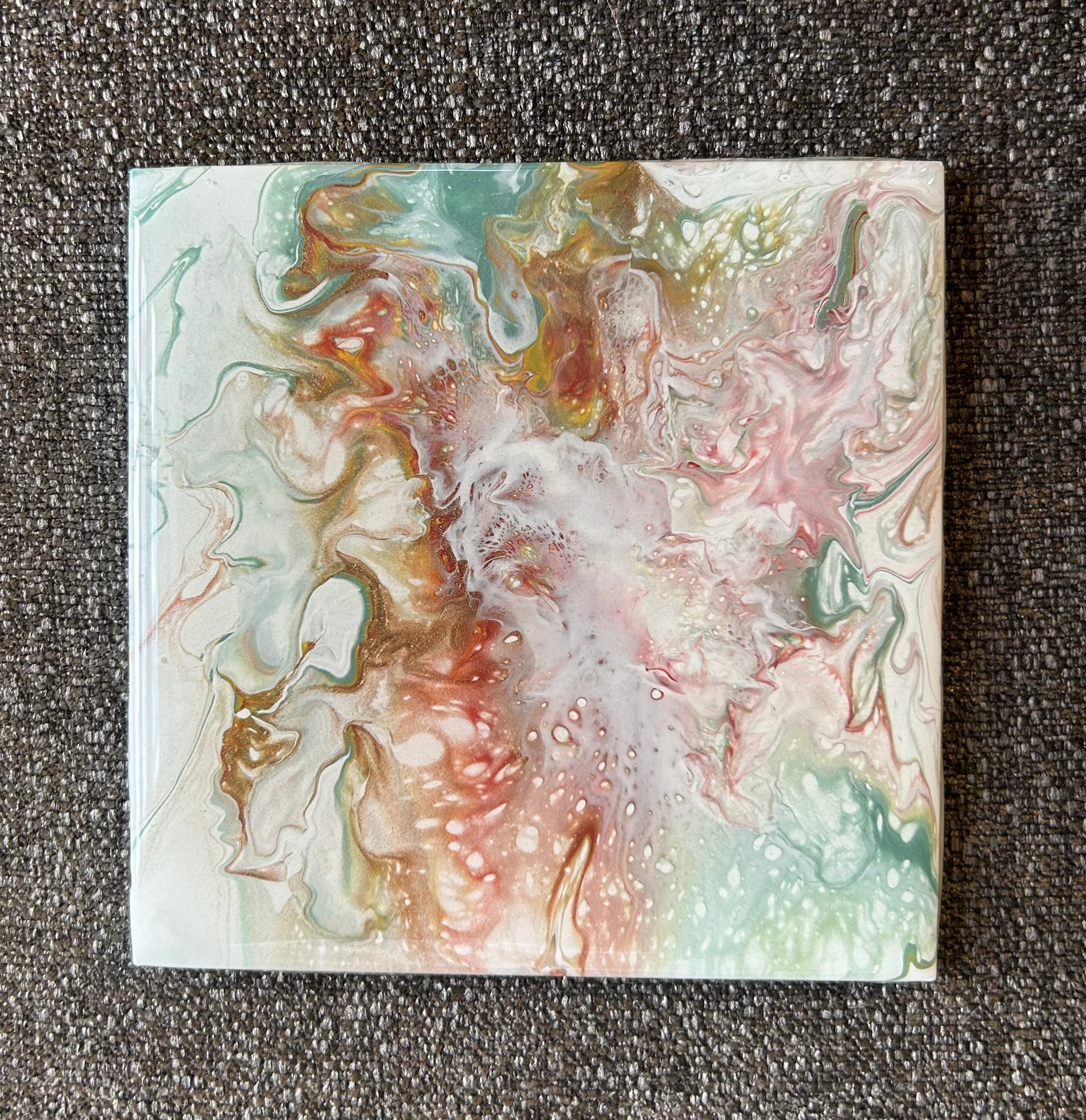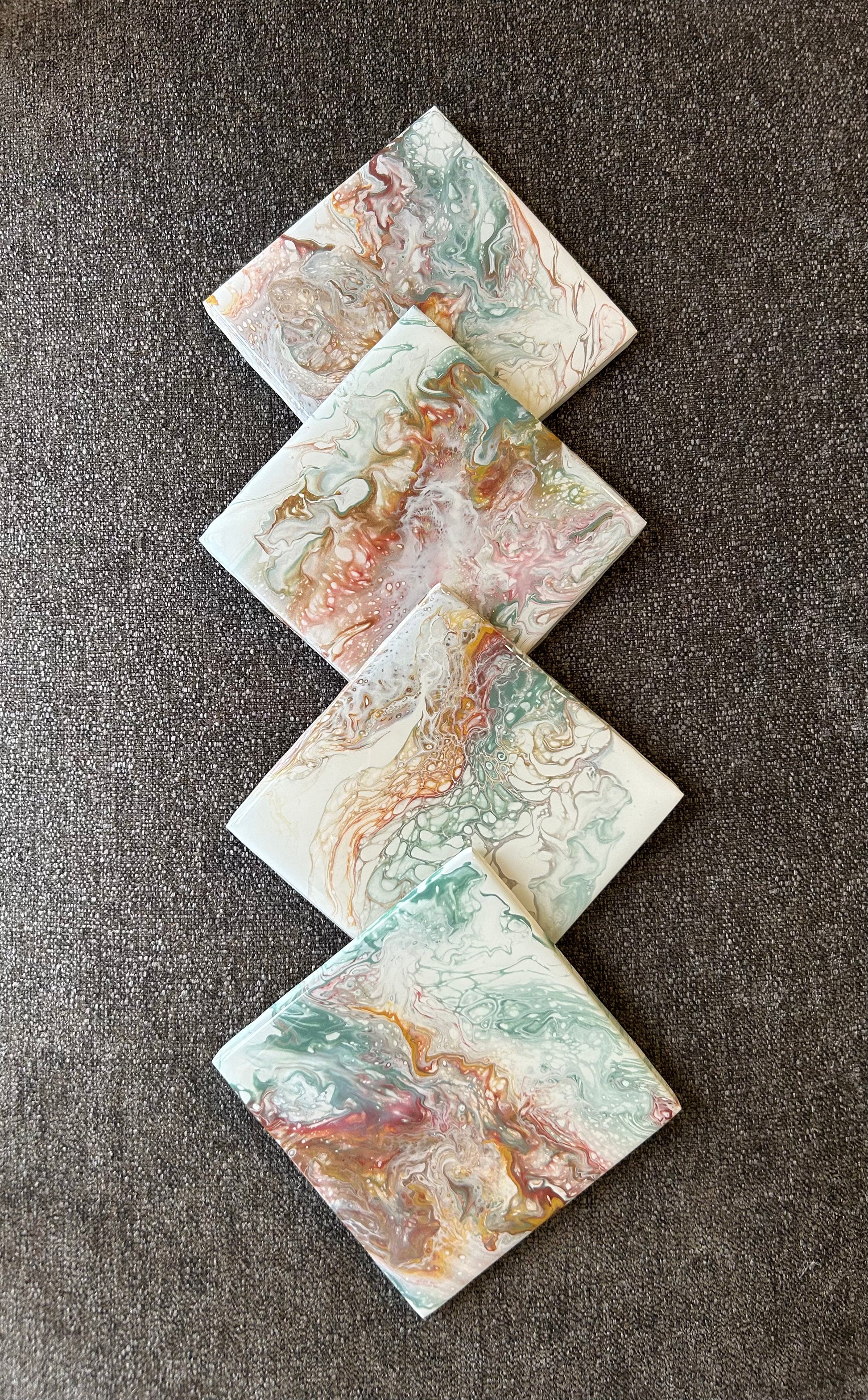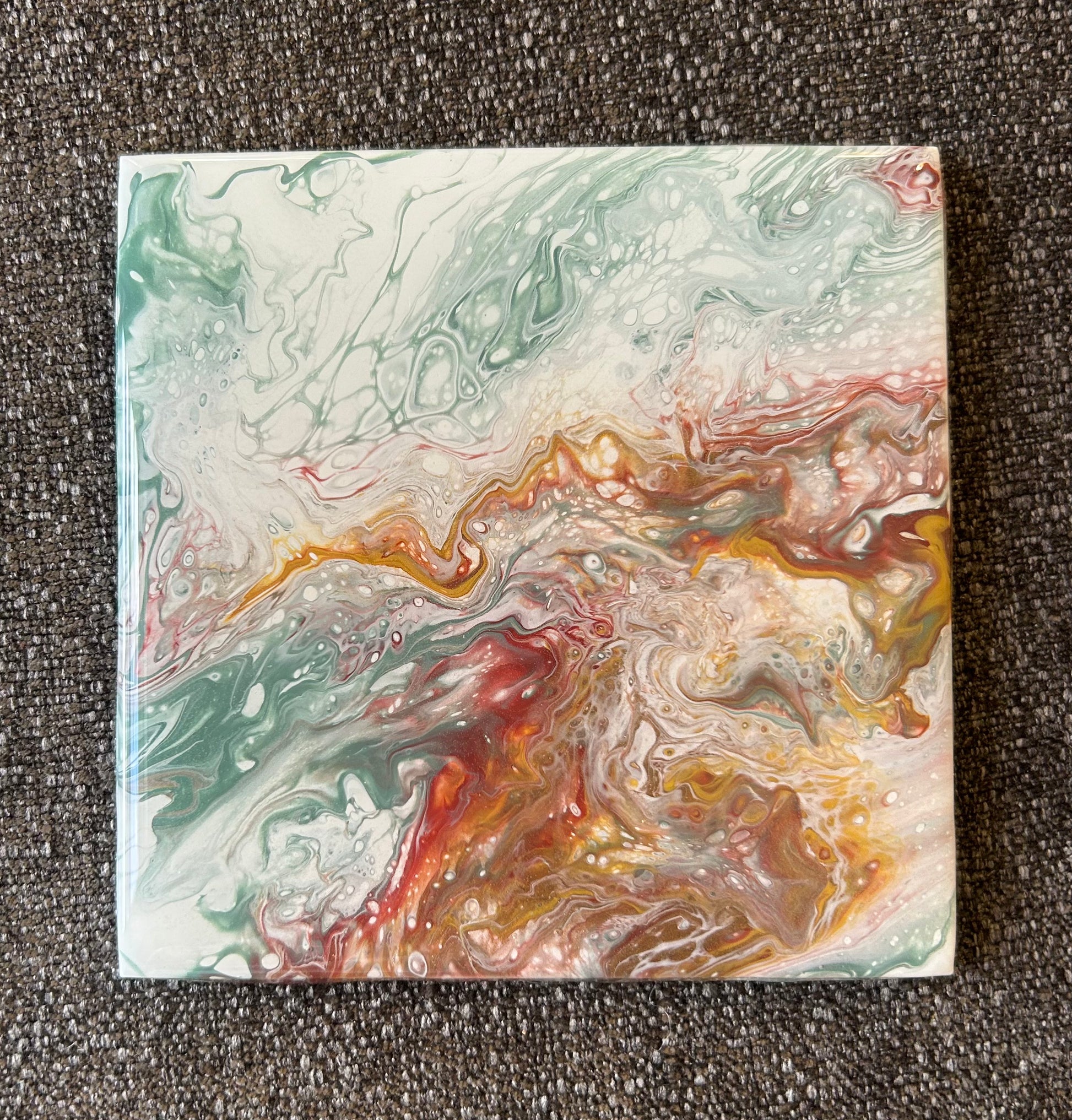 These beautiful fluid art coasters are hand painted and uniquely designed in shades of ivory, green, cranberry, mustard and copper. The set includes 4 different coasters using the same colors so they compliment each other. Each tile measures 4x4 and has been resin sealed and finished with a cork backing to protect furniture. The ceramic tiles can be used for hot or cold beverages.