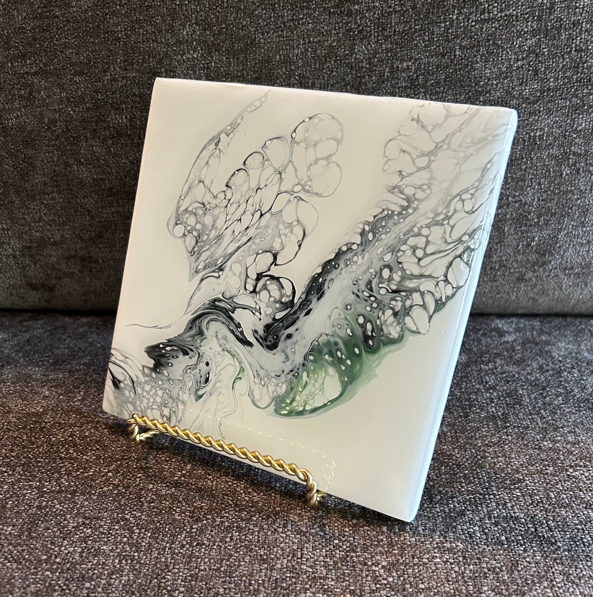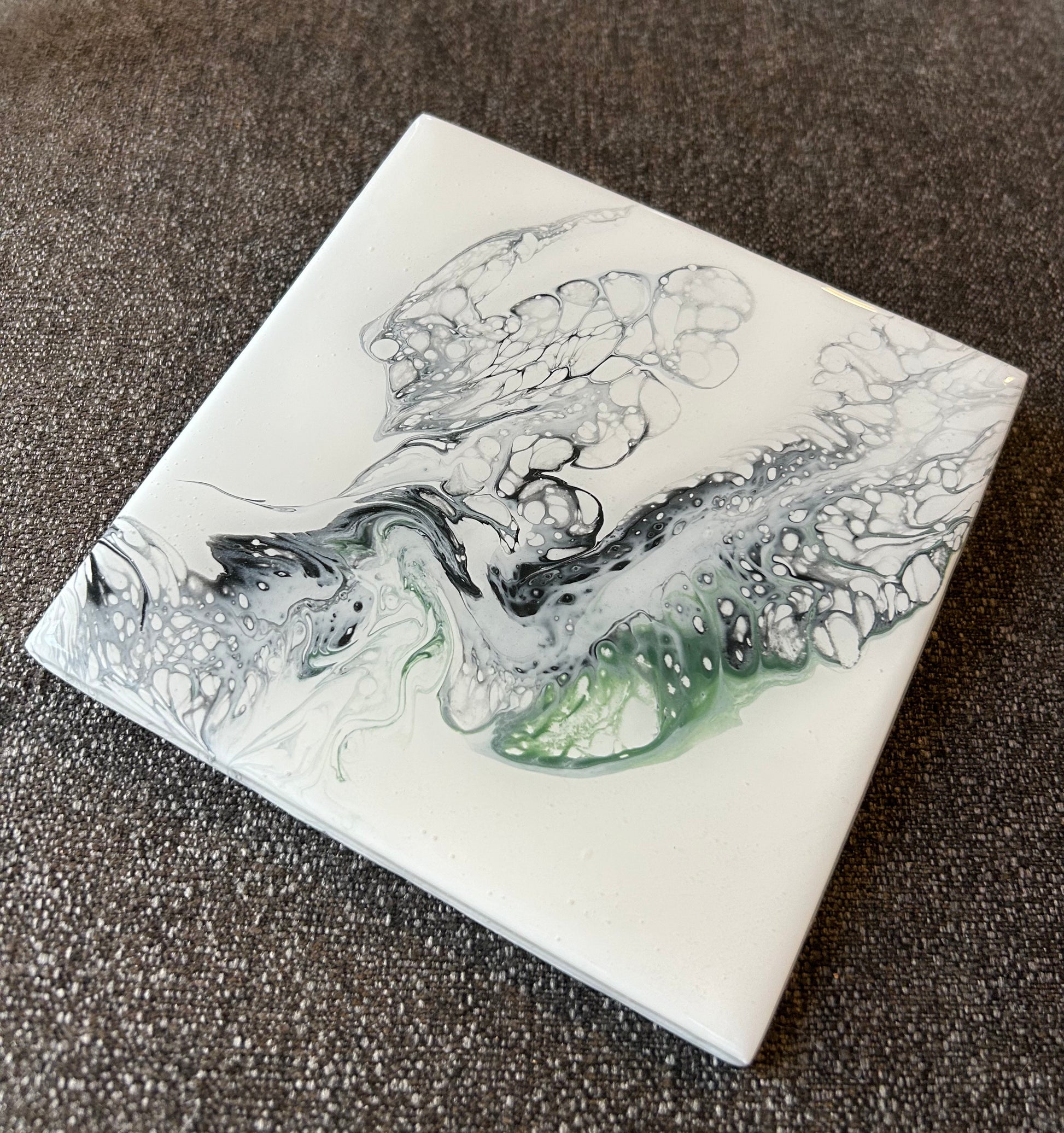 This beautiful decorative fluid art tile has been hand painted and uniquely designed in shades of ivory, pearl, green, black and gray acrylics. Great to use as a trivet under foods, as a plant plate or for decorative display. The tile measures 6x6 and has been sealed with resin for protection and durability making it useful for hot or cold items. Backed with cork to prevent slips and scratches on surfaces.